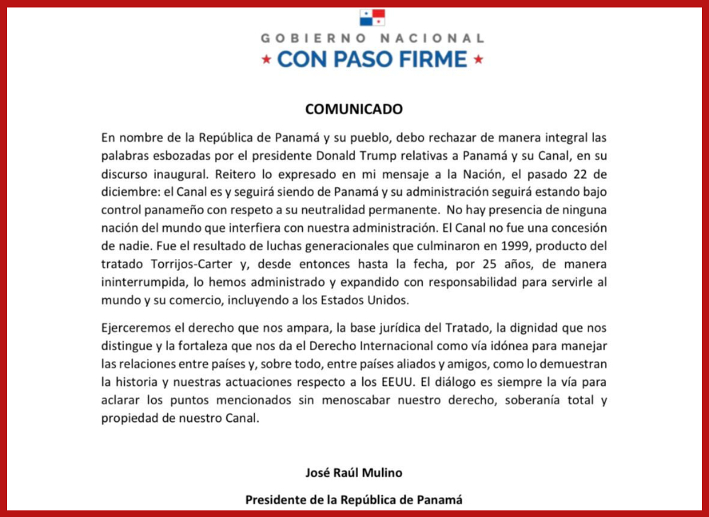 “El Canal no fue una concesión de nadie: fue el resultado de luchas generacionales que culminaron en 1999, producto del tratado Torrijos-Carter”, subrayó el mandatario panameño, quien no felicitó a Trump por su nuevo mandato.