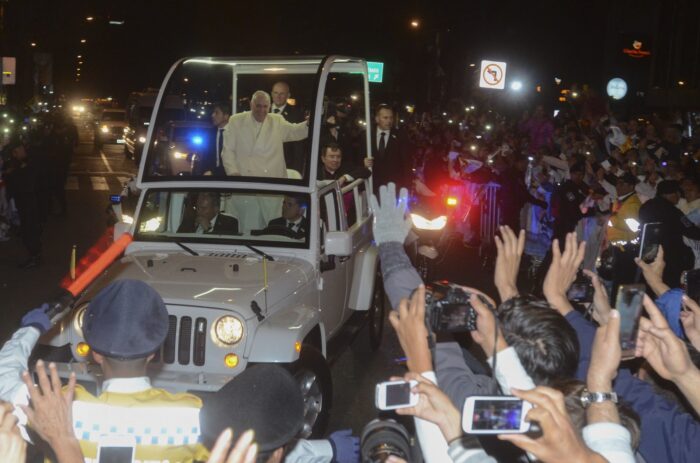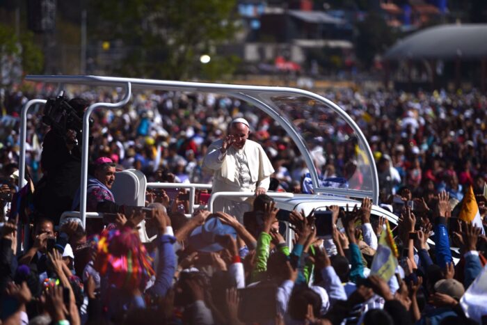 Una vez concluida su reunión con Peña, el Papa Francisco salió de Palacio Nacional a las 11:00 horas y realizó un recorrido en el papamóvil por la plancha del Zócalo capitalino.
