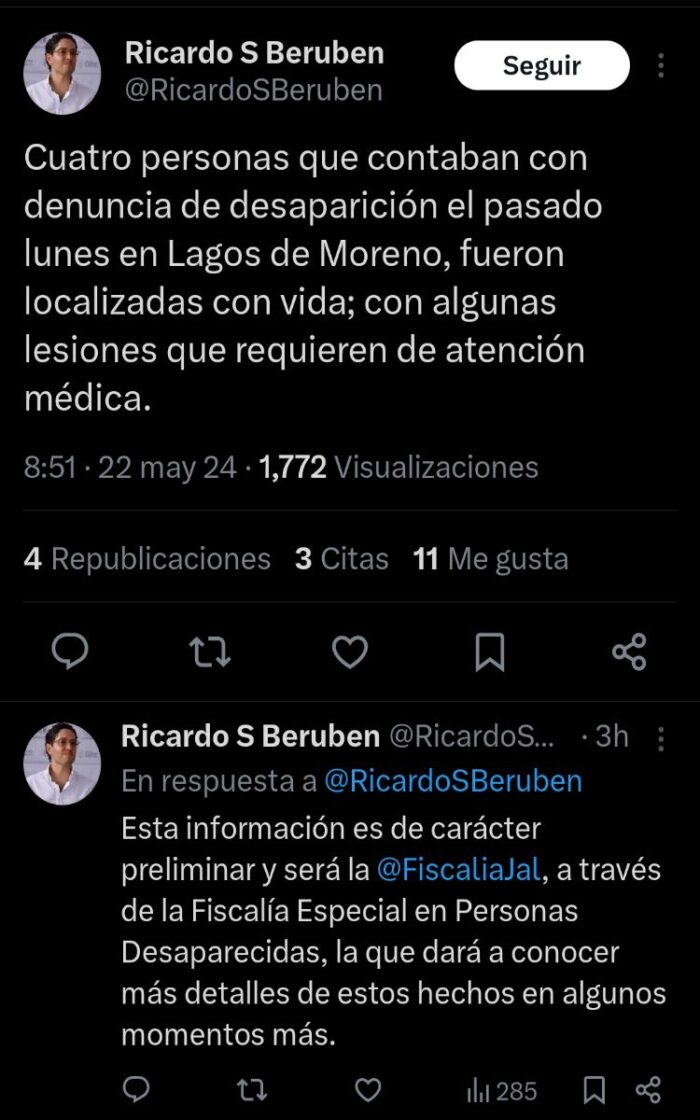 “Esta información es de carácter preliminar y será la Fiscalía de Jalisco, a través de la Fiscalía Especial en Personas Desaparecidas, la que dará a conocer más detalles de estos hechos en algunos momentos más“.