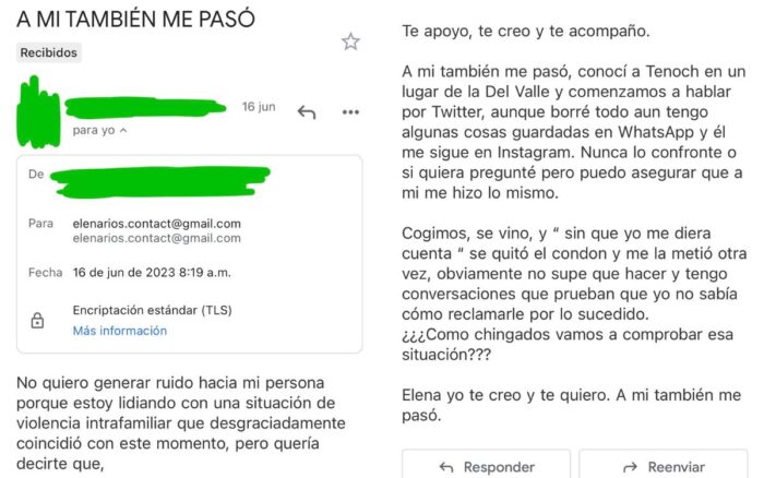 “A mi también me pasó, conocí a Tenoch en un lugar de la Del Valle y comenzamos a hablar por Twitter, […] Cogimos, se vino, y ” sin que yo me diera cuenta” se quitó el condón y me la metió otra vez, obviamente no supe que hacer y tengo conversaciones que prueban que yo no sabía cómo reclamarle por lo sucedido.” escribió la víctima.