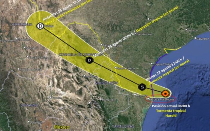 La tormenta tropical ‘Harold’ se formó en las costas de Tamaulipas, cerca de la frontera con Estados Unidos, y se dirige con dirección al sureste Texas.