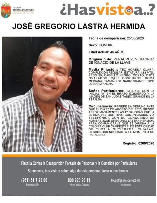 José Gregorio Lastra Hermida, originario de Veracruz, quien tenía 46 años, fue reportado el 25 de agosto de 2020 como desaparecido luego de una última comunicación telefónica con su concubina, en la que le informó que se dirigía a la colonia Club Campestre de Tuxtla Gutiérrez, sin que posteriormente se supiera de su paradero.