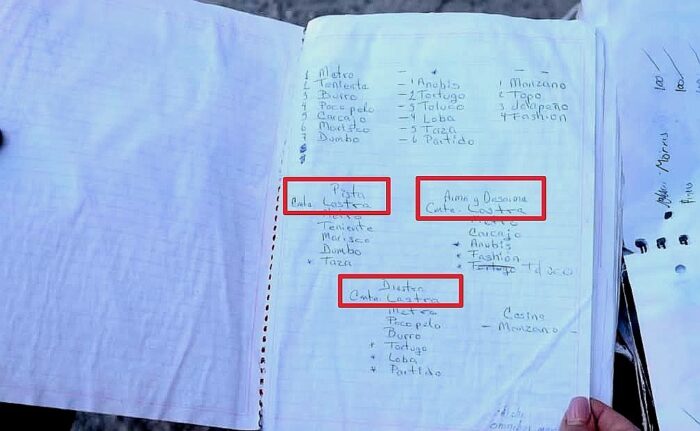 Entre las hojas de cuadernos también se hallaron textos personales como la carta que escribió a su pareja una persona que estaba en el lugar; así como números telefónicos, posiblemente de madres o padres de las y los reclutas, así como indicaciones sobre “3 bolsas” en el congelador que no debían tocar porque estaban “calientes”.