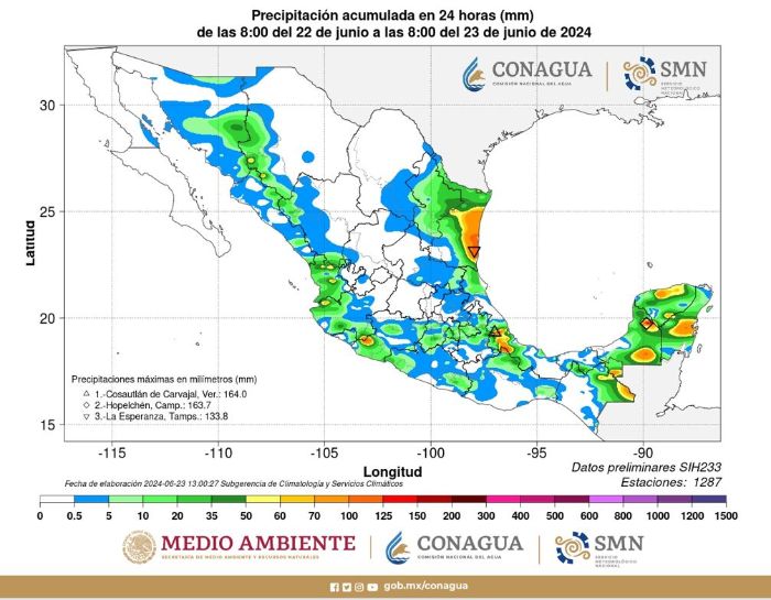 Además de lluvias intensas (de 75 a 150 mm) en Campeche, Chiapas, Colima, Hidalgo, Jalisco, Michoacán, Nayarit, Oaxaca, Puebla, Querétaro, Quintana Roo, Tabasco y Yucatán.