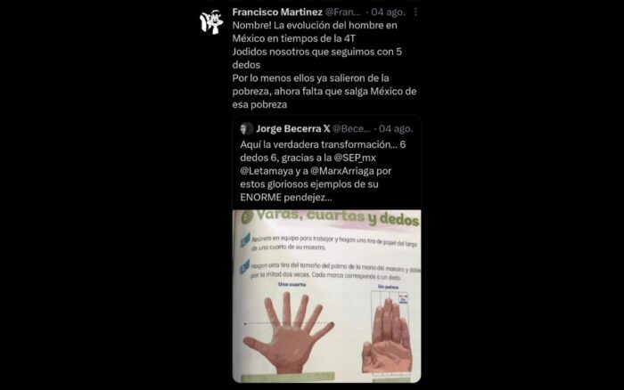 “Con razón los de la 4T de @lopezobrador_ roban más, tienen unas manotas de 6 dedos (sic)”, señala una publicación de X con más de 100 mil compartidos.