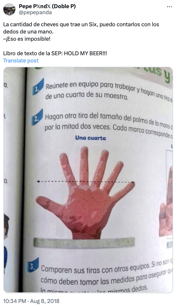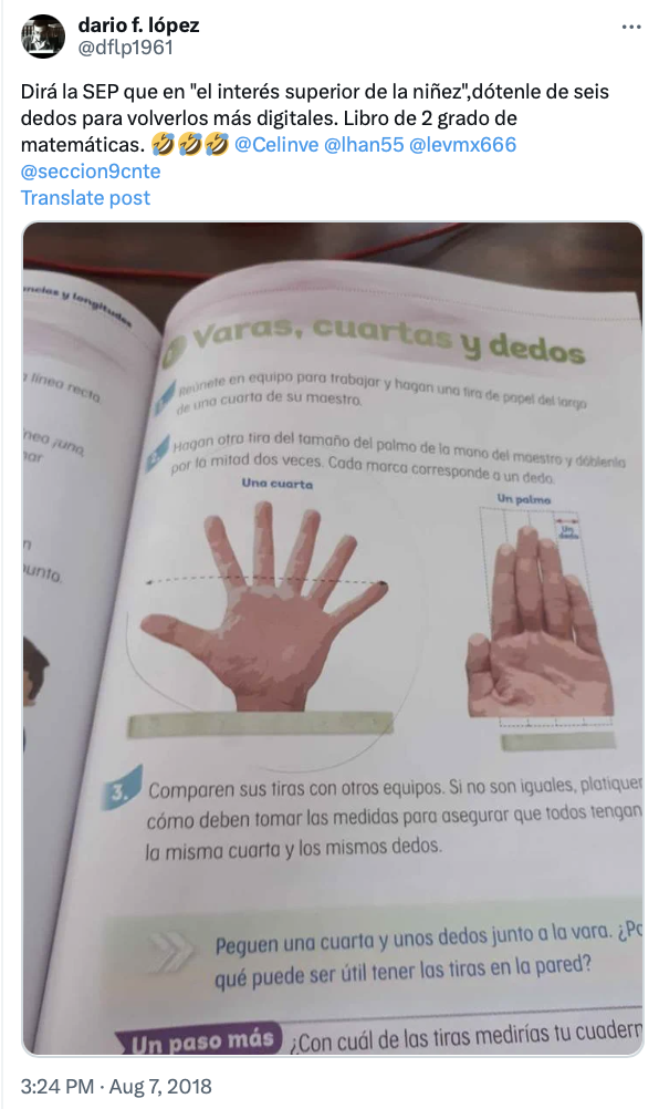 Hechos: La fotografía de la mano con seis dedos no está en los nuevos libros de texto de la SEP, sino en el libro de Matemáticas Segundo Grado del ciclo escolar 2018-2019, a cargo del gobierno de Enrique Peña Nieto, como es posible comprobar a través de un rastreo por distintos buscadores, y corroboró a EFE la misma dependencia responsable de los textos.