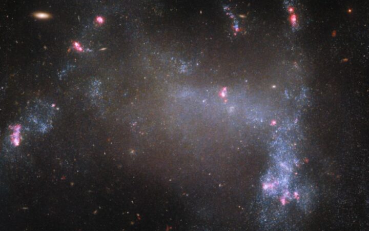 Las regiones de formación estelar de UGC 5829 son fácilmente visibles en esta imagen como nebulosas o nubes de color rosa brillante.