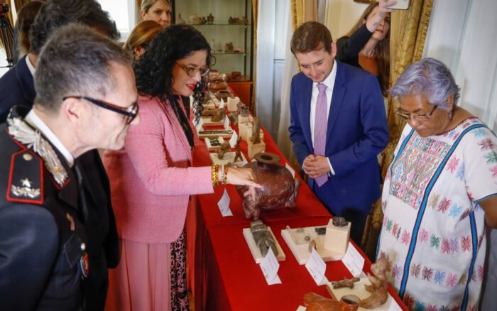 Durante la ceremonia en la sede de la Embajada de México en Italia, la secretaria Frausto Guerrero detalló que el gobierno mexicano ha condenado energéticamente las subastas y venta de piezas arqueológicas en el extranjero.