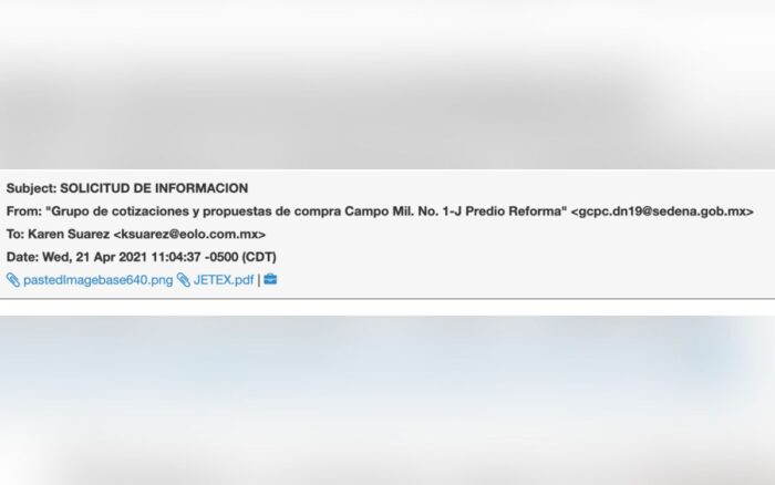 Primer correo que la Sedena envió a la directora comercial de Eolo Plus. Foto: MCCI