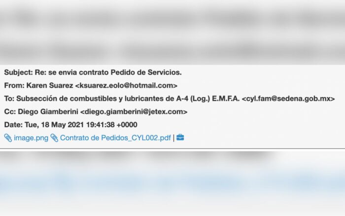 Las asignaciones de la Fuerza Aérea Mexicana fueron a nombre de Jetex, aunque la persona que intervino en las negociaciones fue la directora comercial de Eolo Plus, según consta en cientos de documentos revisados por MCCI.