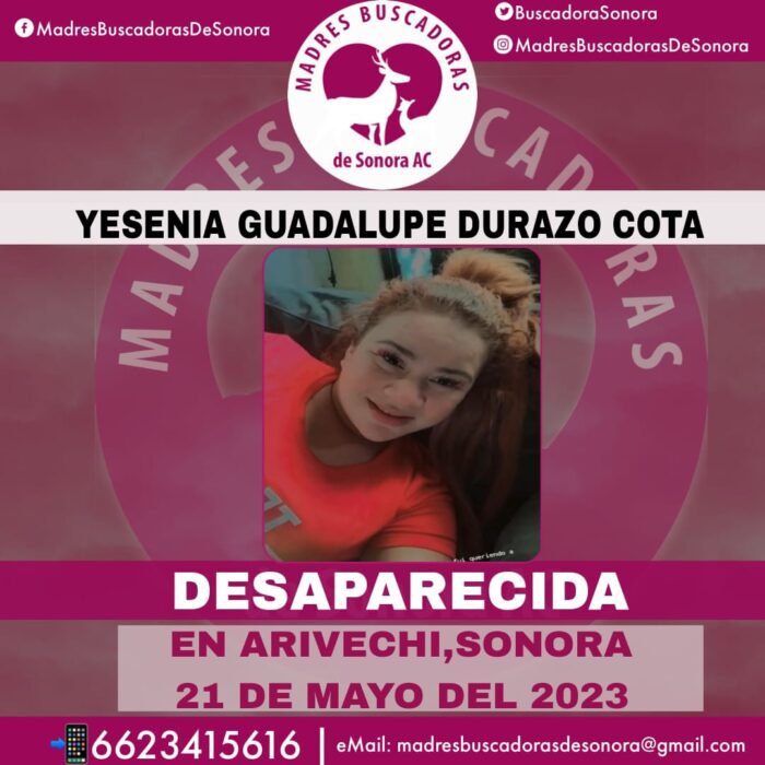 Este miércoles se reportó la desaparición de Yesenia Guadalupe Durazo Cota, quien busca a su esposo y es integrante de la colectiva Madres Buscadoras de Sonora.
