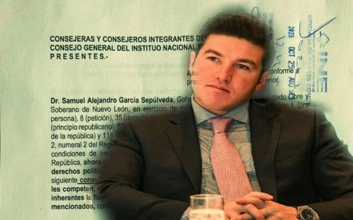 El gobernador de Nuevo León, Samuel García Sepúlveda entregó esta mañana un documento ante el INE para resolver su situación política ante sus aspiraciones presidenciales.