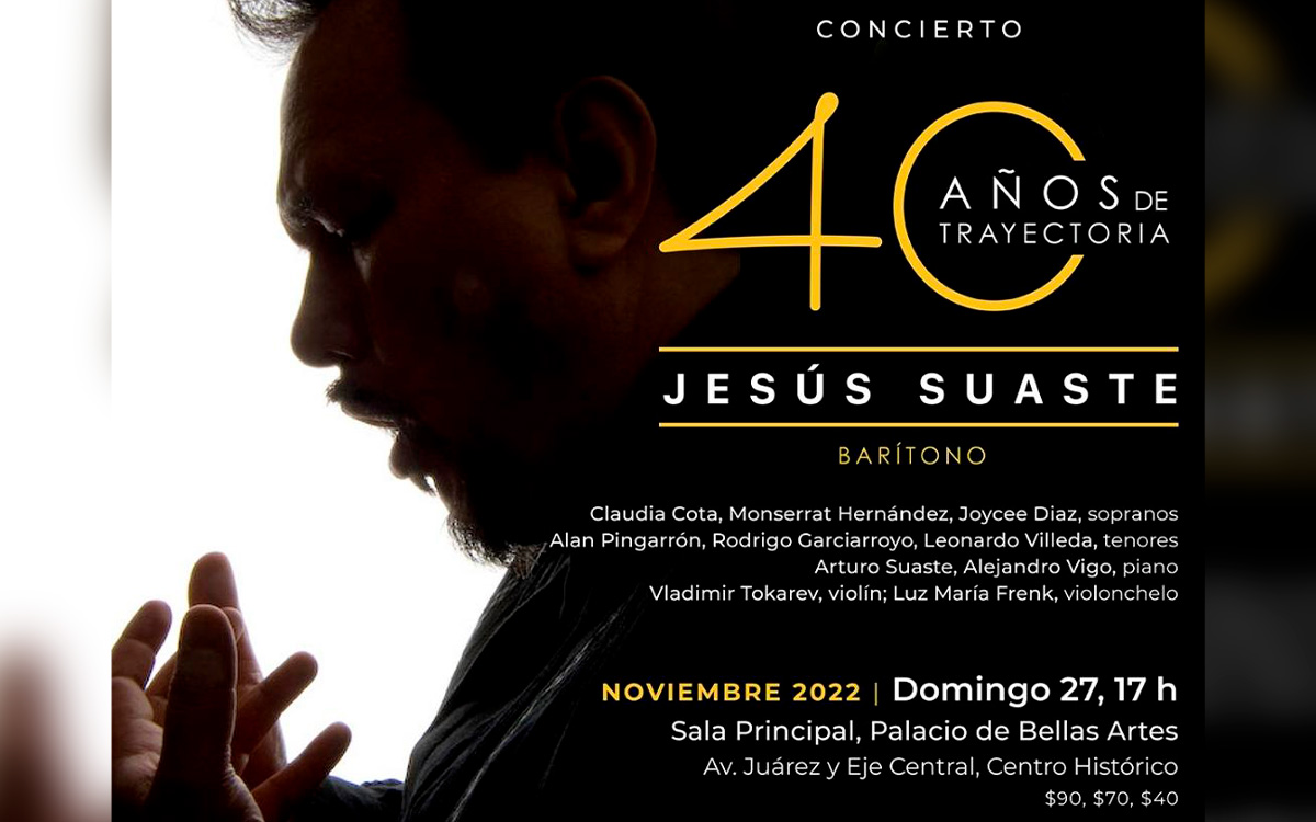 El barítono Jesús Suaste celebrará cuatro décadas de actividad artística con un concierto el domingo 27 de noviembre a las 17:00 horas en la Sala Principal del Palacio de Bellas Artes.