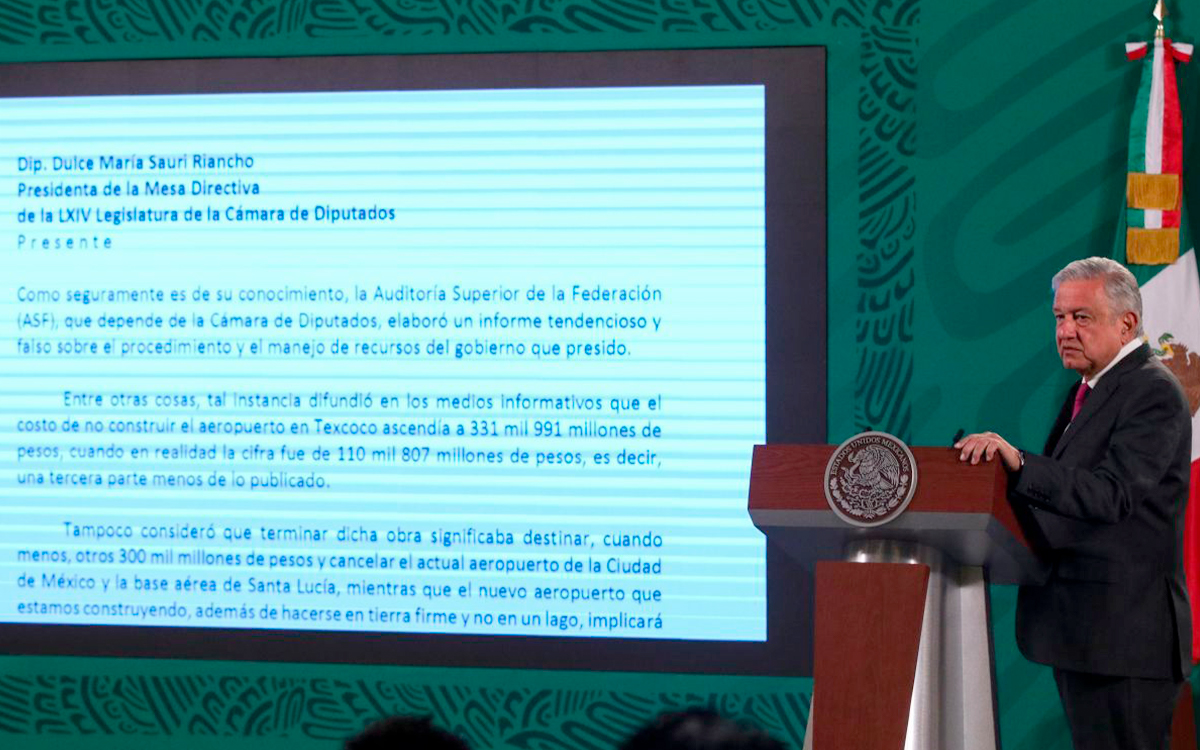 Dulce María Sauri Riancho, presidenta de la Cámara de Diputados, indicó que recibió ayer la carta de AMLO en la que pide investigar a la Auditoría Superior de la Federación, lo cual es una “afortunada coincidencia con este proceso que se está dando”. Apuntó dos caminos para despejar estas dudas: las reuniones con la ASF y la instrucción para que el órgano técnico de la comisión de vigilancia empiece a hacer investigación específica sobre la auditoría al Nuevo Aeropuerto.