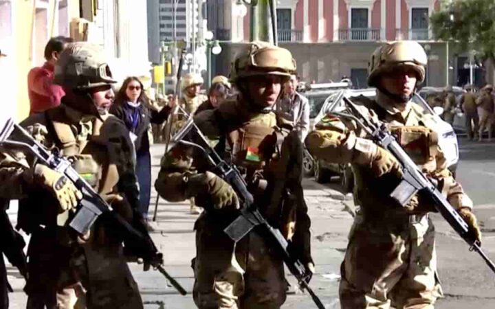 Soldados fuertemente armados y vehículos blindados se vieron llegar a la céntrica Plaza Murillo de La Paz, según los videos difundidos.