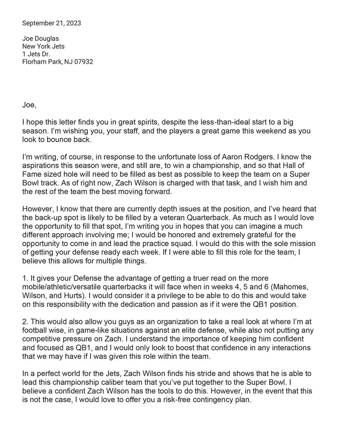 De ahí su decisión de escribir esta carta a los Jets en la que destacó que su experiencia es un punto para tomar en cuenta.