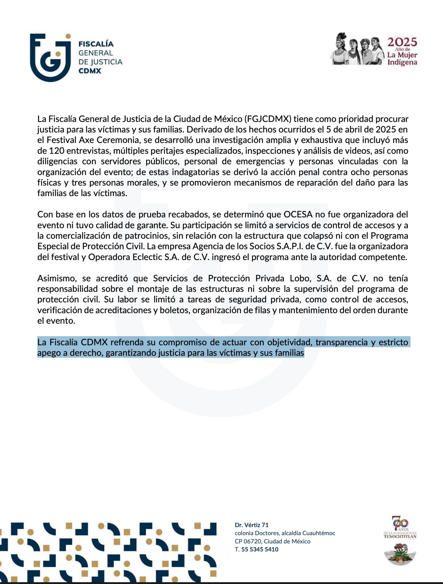 “La Fiscalía General de Justicia de la Ciudad de México (FGJCDMX) tiene como prioridad procurar justicia para las víctimas y sus familias. Derivado de los hechos ocurridos el 5 de abril de 2025 en el Festival Axe Ceremonia, se desarrolló una investigación amplia y exhaustiva que incluyó más de 120 entrevistas, múltiples peritajes especializados, inspecciones y análisis de videos, así como diligencias con servidores públicos, personal de emergencias y personas vinculadas con la