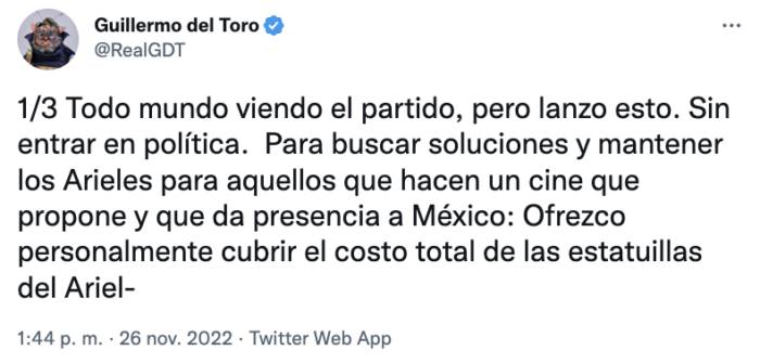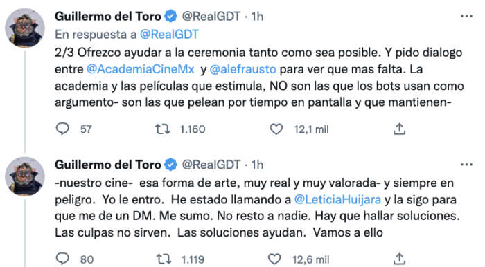 A través de tres tuits en su cuenta oficial, Guillermo del Toro, ganador de dos Óscar como mejor director y mejor película por La forma del agua, aclaró que su postura no es para entrar en política, sino que es con el objetivo de apoyar la industria cinematográfica nacional y encontrar soluciones.