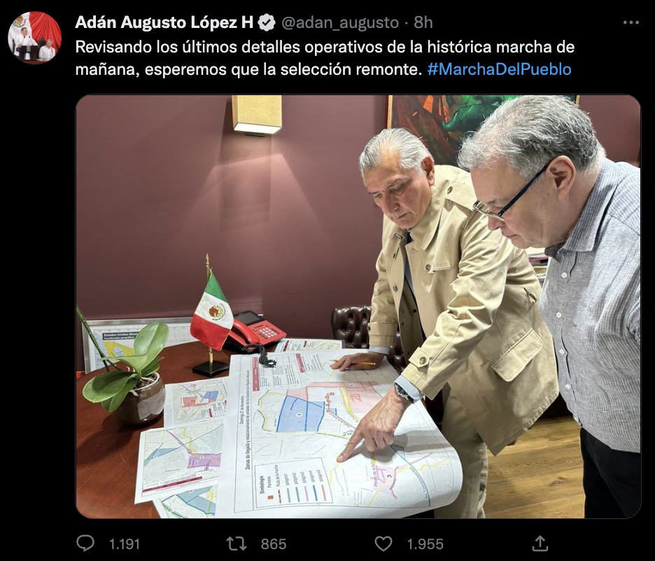 Este sábado, el titular de la Secretaría de Gobernación, Adán Augusto López, publicó una fotografía en la que se le observa dar los últimos detalles del operativo que se pondrá en marcha este domingo.