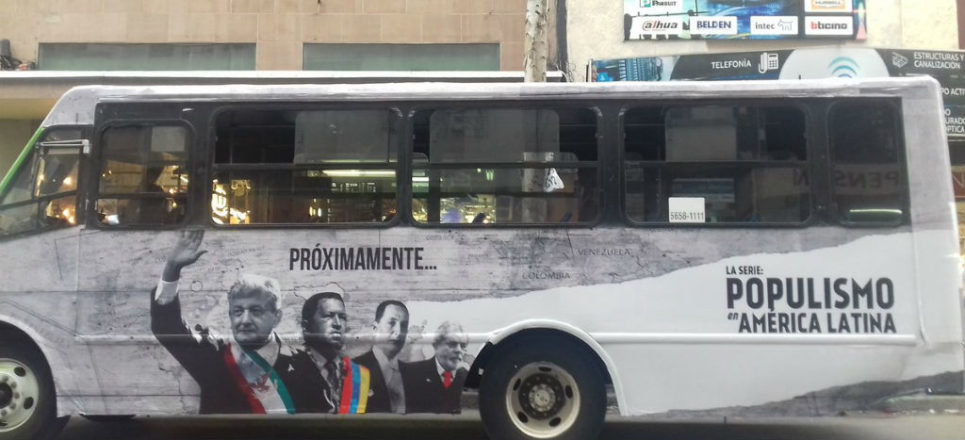 Respecto a la publicidad de la serie “Populismo en América Latina”, documental que la productora denominada “La División” se atribuyó este jueves, la Semovi informó que ninguna empresa ha solicitado los permisos correspondientes para que se puedan colocar anuncios en autobuses, por lo que ninguna unidad de transporte público cuenta con autorización para portarla y se trata de propaganda irregular.