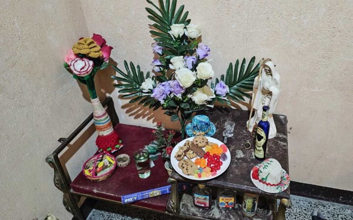 Los investigadores hallaron un mueble a manera de altar u ofrenda, con dulces, galletas, dinero y botellas de licores como tequila. En la pequeña mesa se encuentran estatuas presumiblemente de la Santa Muerte, dos flores con rosas blancas, moradas y rosadas, así como flores de tela. Igualmente, sombreros, un vaso con agua e incienso.