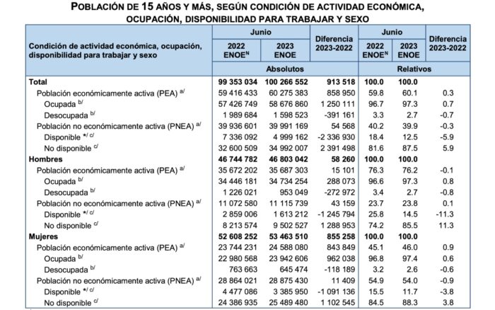 De acuerdo con este organismo, la PEA del sexto mes del año fue de 60.3 millones de personas de 15 años y más, lo que representó una tasa de participación de 60.1% y una población activa superior en 859 mil a la de junio de 2022.