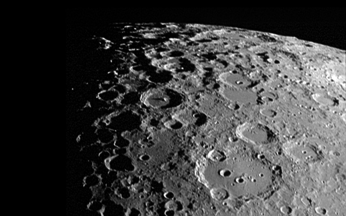 La imagen es de un parche de 1.200 kilómetros de ancho cerca del centro del último cuarto de luna. Muchos cráteres familiares son visibles, incluido el cráter Arzachel relativamente nuevo, justo a la izquierda del centro. El escarpe de falla prominente llamado Straight Wall es visible atravesando las llanuras de lava en la parte inferior izquierda del centro.