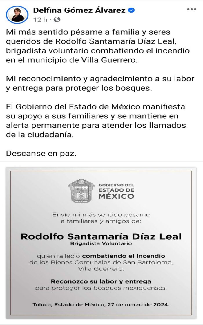 “Mi más sentido pésame a familia y seres queridos de Rodolfo Santamaría Díaz Leal, brigadista voluntario combatiendo el incendio en el municipio de Villa Guerrero. Mi reconocimiento y agradecimiento a su labor y entrega para proteger los bosques.”.