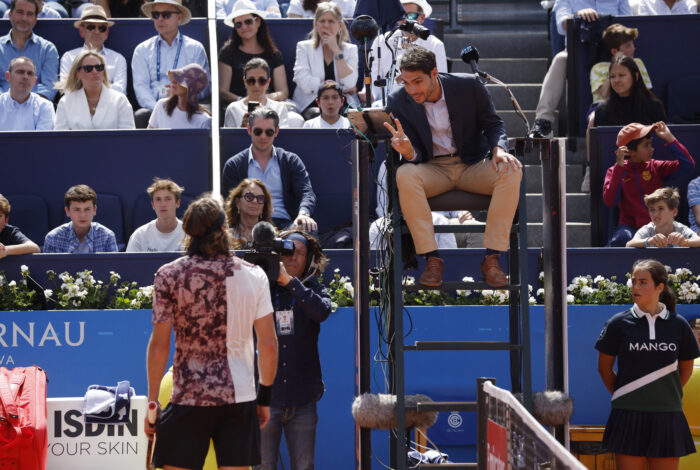 Stefanos Tsitsipas discutiendo con el juez de silla.
