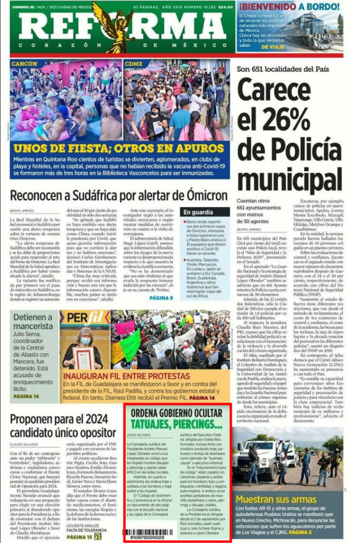 La Consejería Jurídica de Presidencia de la República afirmó que es falso que la Consejería Jurídica haya emitido un ‘código de vestimenta y convivencia’ que ordena a los empleados ocultar sus tatuajes y perforaciones, como lo publicó el diario Reforma en una nota de primera plana.