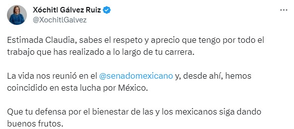 A través de su cuenta de Twitter, la senadora Xóchitl Gálvez externó su respeto y aprecio hacia Ruiz Massieu por el trabajo que ha realizado a lo largo de su carrera. “Que tu defensa por el bienestar de las y los mexicanos siga dando buenos frutos”, añadió.