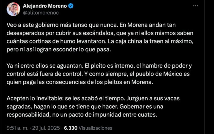“Veo a este gobierno más tenso que nunca. En Morena andan tan desesperados por cubrir sus escándalos, que ya ni ellos mismos saben cuántas cortinas de humo levantaron. La caja china la traen al máximo, pero ni así logran esconder lo que pasa“, publicó en sus redes sociales.