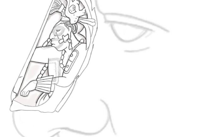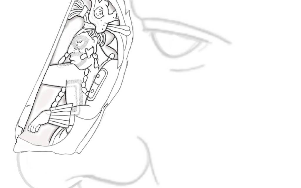 La cresta del hueso con que se elaboró el adorno nasal se presenta como el límite de un portal que el personaje cruza para comunicarse con los dioses y antepasados, escena común en el arte maya del periodo Clásico (250-900 d.C.).