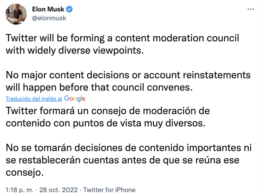 Te puede interesar > Twitter tendrá un ‘consejo de moderación de contenido’, anuncia Elon Musk