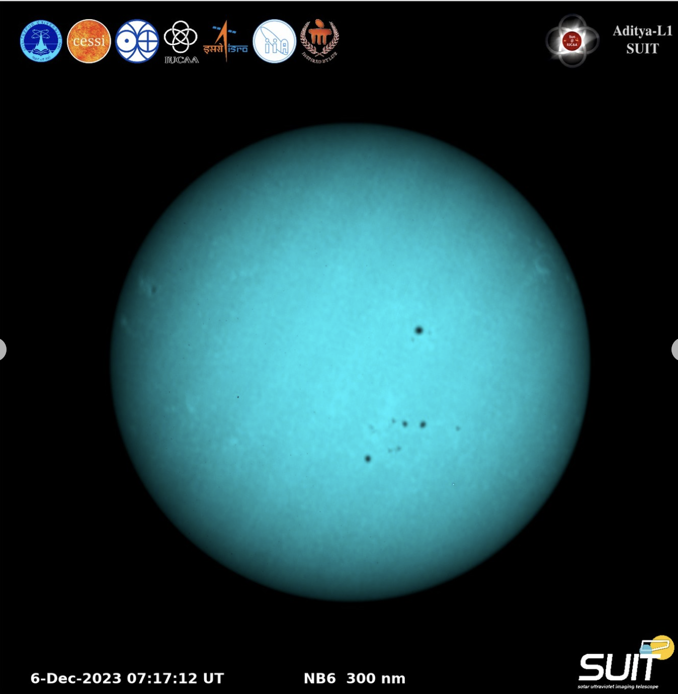 El instrumento de luz ultravioleta SUIT del observatorio espacial indio Aditya-L1 capturó las primeras imágenes de disco completo del Sol en longitud de onda de 200-400 nm.