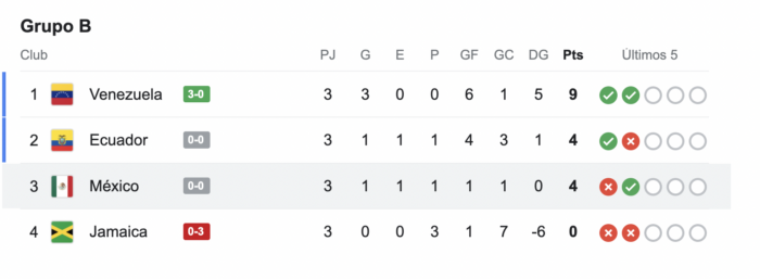 Ecuador llegó a cuatro puntos y mejor diferencia de goles para ocupar el segundo lugar del Grupo B, liderado por Venezuela con 9; mientras, México también con 4 unidades ocupó el tercer lugar y quedó eliminado, junto con Jamaica en el fondo sin sumar.