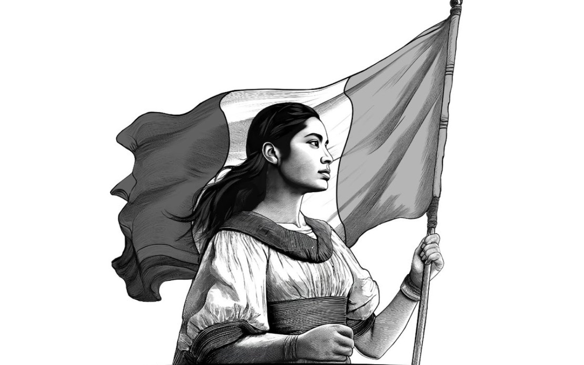 En la descripción de la imagen se apuntó que “la joven mira con firmeza y esperanza hacia la izquierda, simbolizando la lucha del pueblo por alcanzar la justicia y la libertad”.