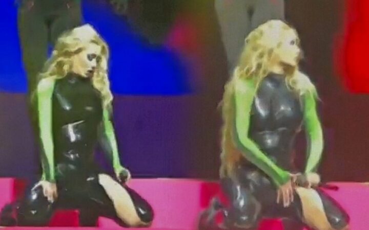 Por lo anterior, la cantante inmediatamente intentó cubrirse la parte de su pierna que quedó expuesta e incluso un miembro de su equipo de producción le otorgó una tela negra para cubrirse y seguir con el espectáculo.